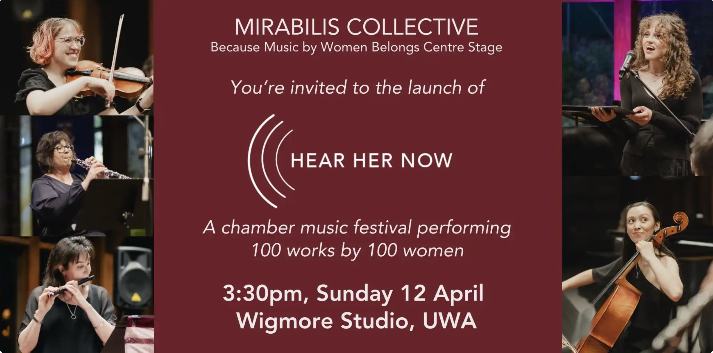 Hear Her Now is Mirabilis Collective’s debut chamber music festival celebrating music written by women across genres, generations, and stories. From early music to contemporary voices, the festival brings together performance, storytelling, education, and community engagement, led by an intergenerational ensemble of professional women musicians.